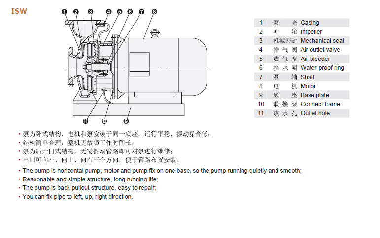ISW型卧式离心泵根据IS型离心泵与立式泵的独特结构组合设计,并严格按照国际标准ISO2858和最新的国家管道离心泵标准JB/T53058-93进行设计制造的高效节能产品。该泵采用国内先进水力模型优化设计而成。同时根据使用温度、介质等不同在ISW型基础上派生出热水泵、高温泵、化工泵、油泵等,是目前国家标准定型推广产品。 产品特点 1、吸入压力≤1.0Mpa,或泵系统最高工作压力≤1.6Mpa,即泵吸入口压力+泵扬程≤ 1.6Mpa、泵静压试验压力为2.5Mpa,订货时请注明系统工作压力。泵系统工作压力大于 1.6Mpa时应在订货时另行提出。以便在制造时泵的过流部件和联接部分采用铸钢材料。 2、环境温度<40℃,相对湿度<95%。 3、所输送介质中固体颗粒体积含量不超过单位体积的0.1%,粒度<0.2mm. 注:如使用介质为带有细小颗粒,请在订货时说明,以便采用耐磨式机械密封 产品用途 1、ISW型管道离心泵,供输送清水及物理化学性质类似于清水的其他液体之用,适用于工业和城市给排水,高层建筑增压送水,园林灌溉,消防增压及设备配套,使用温度T:≤80℃。 2、ISWR型热水(高温)循环泵广泛适用于能源、冶金、化工、纺织、造纸、以及宾馆饭店等锅炉高温热水增压循环输送及城市采暖系统循环用泵,ISWR使用温度T:≤120℃。 3、ISWH型卧式化工泵,供输送不含固体颗粒,具有腐蚀性,粘度类似于水的液体,适用于石油、化工、冶金、电力、造纸、食品、制药和合成纤维等部门,使用温度T:-20℃-120℃。 4、ISWB型卧式油泵,供输送汽油、柴油、煤油等石油产品,使用温度T:-20℃-120℃。